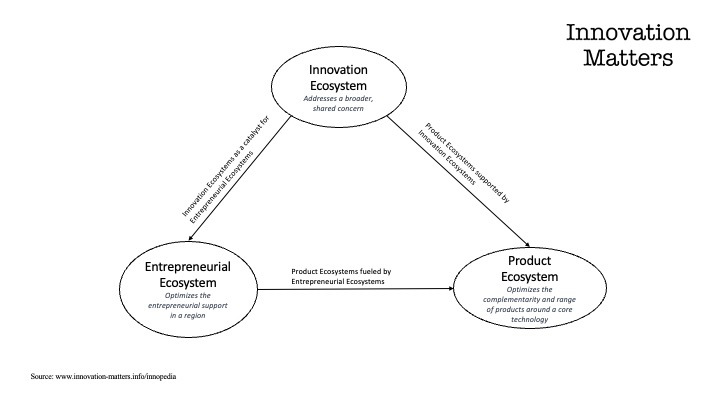 The figure below illustrates the linkages between ecosystems. For example, innovation ecosystems can be a catalyst for entrepreneurial ecosystems. Product innovations are fueled by entrepreneurial ecosystems with new offerings and supported by innovation ecosystems with new discoveries.